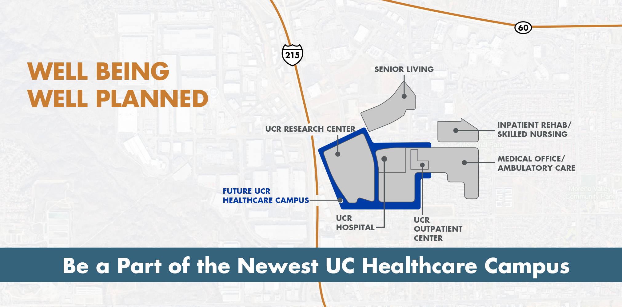 Canyon Springs promotes wellness, offers holistic care, and enhances health service delivery within a restorative campus setting anchored by the University of California Health. The future health campus will include: